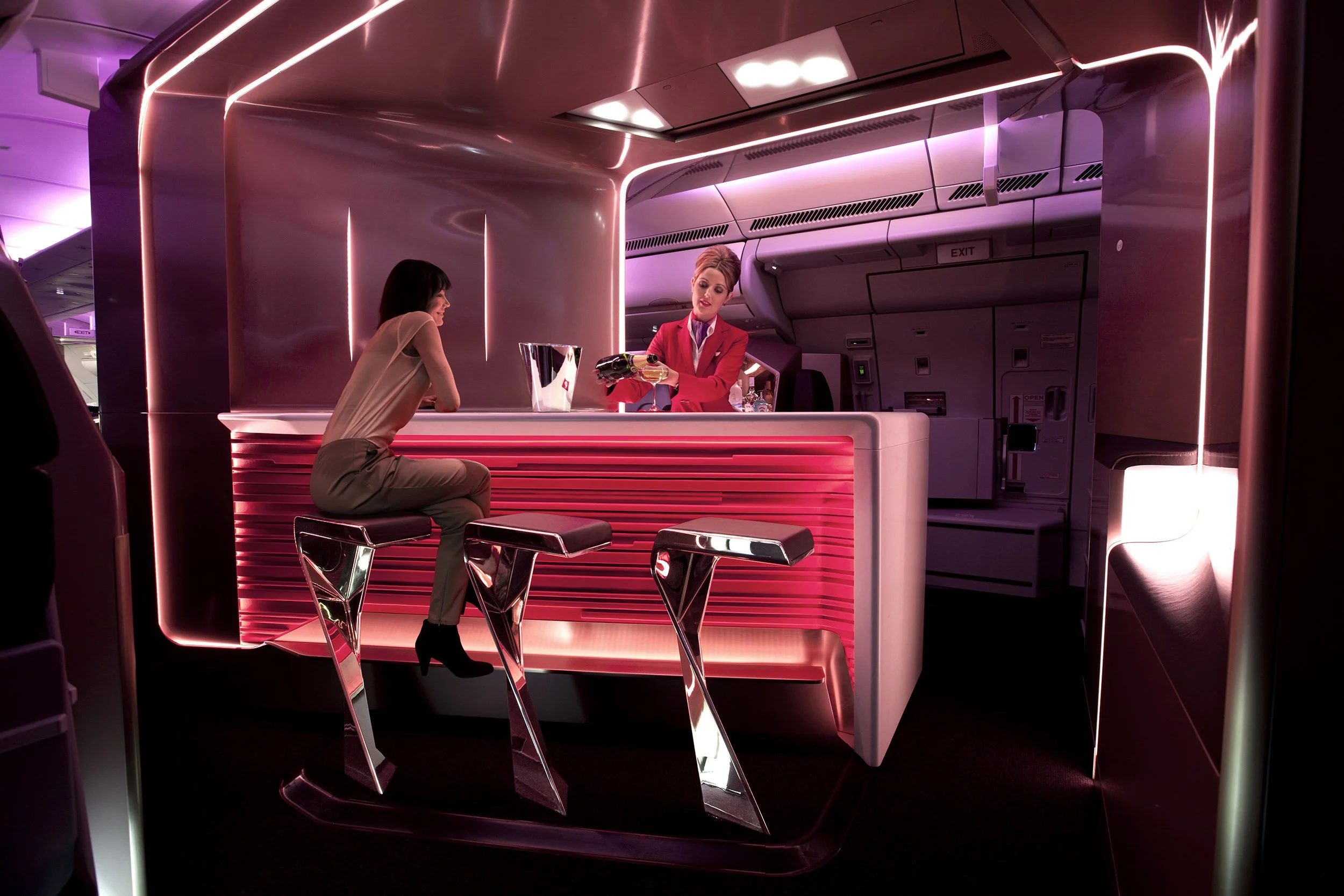 The cantilevered bar stools, side perches and standing room beyond created a convivial destination for Upper Class passengers after take-off, while having an aesthetic that was decidedly futuristic and belonged in the sky.