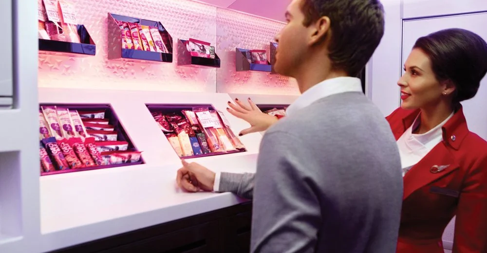 Virgin Atlantic Airlines approached us with a test brief to explore the future of flight which led to a commission to design the new bar and Upper Class Cabin for the Airbus A330 aircraft, new to the VAA fleet. We opened up our bar, allowing everyone to walk around it, reflecting trends happening on the ground with pop-up bars and the new speakeasy. It was also angled to maximise visual impact and to optimise the narrow footprint of an airplane cabin.