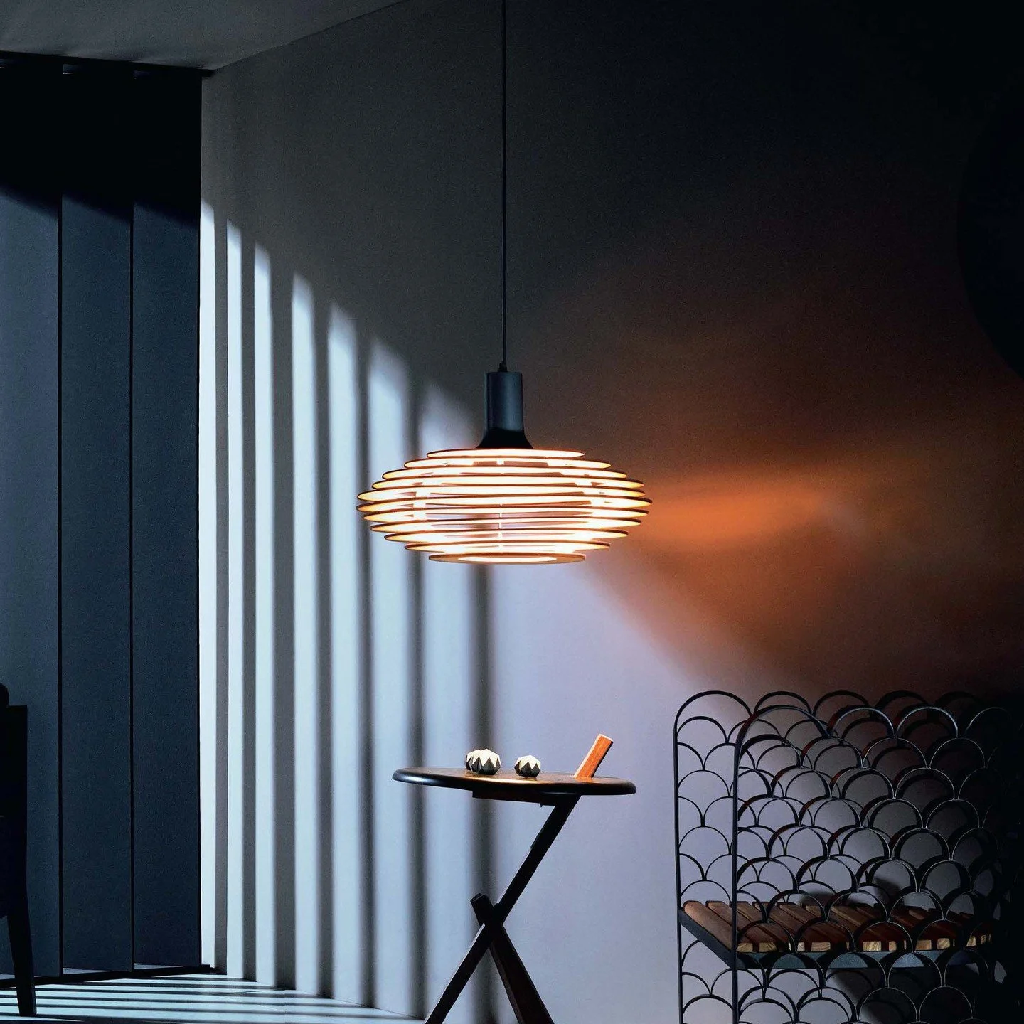 Made from half a sheet of plywood, the Dipper ceiling lamp looks a bit like the end of a honey dipper. Three laser cut spines hold together the ten layers of bevel edged plywood that create the shade. The layering creates a soft diffused horizontal light, as well as throwing light downwards. We use a low energy bulb which emits a white light that is softened and rendered more natural in colour by its reflection off the wood, almost like an old school incandescent glow.