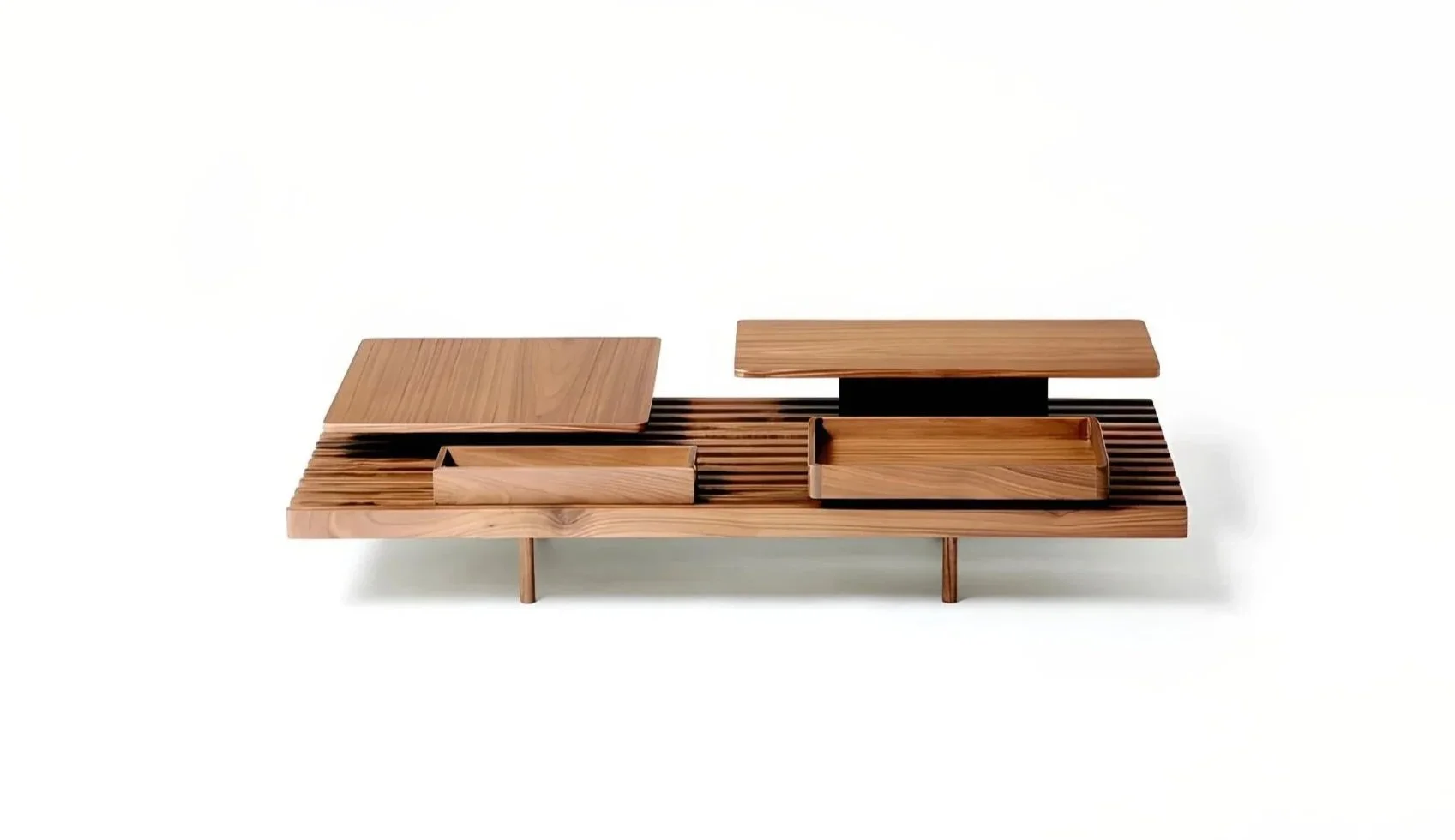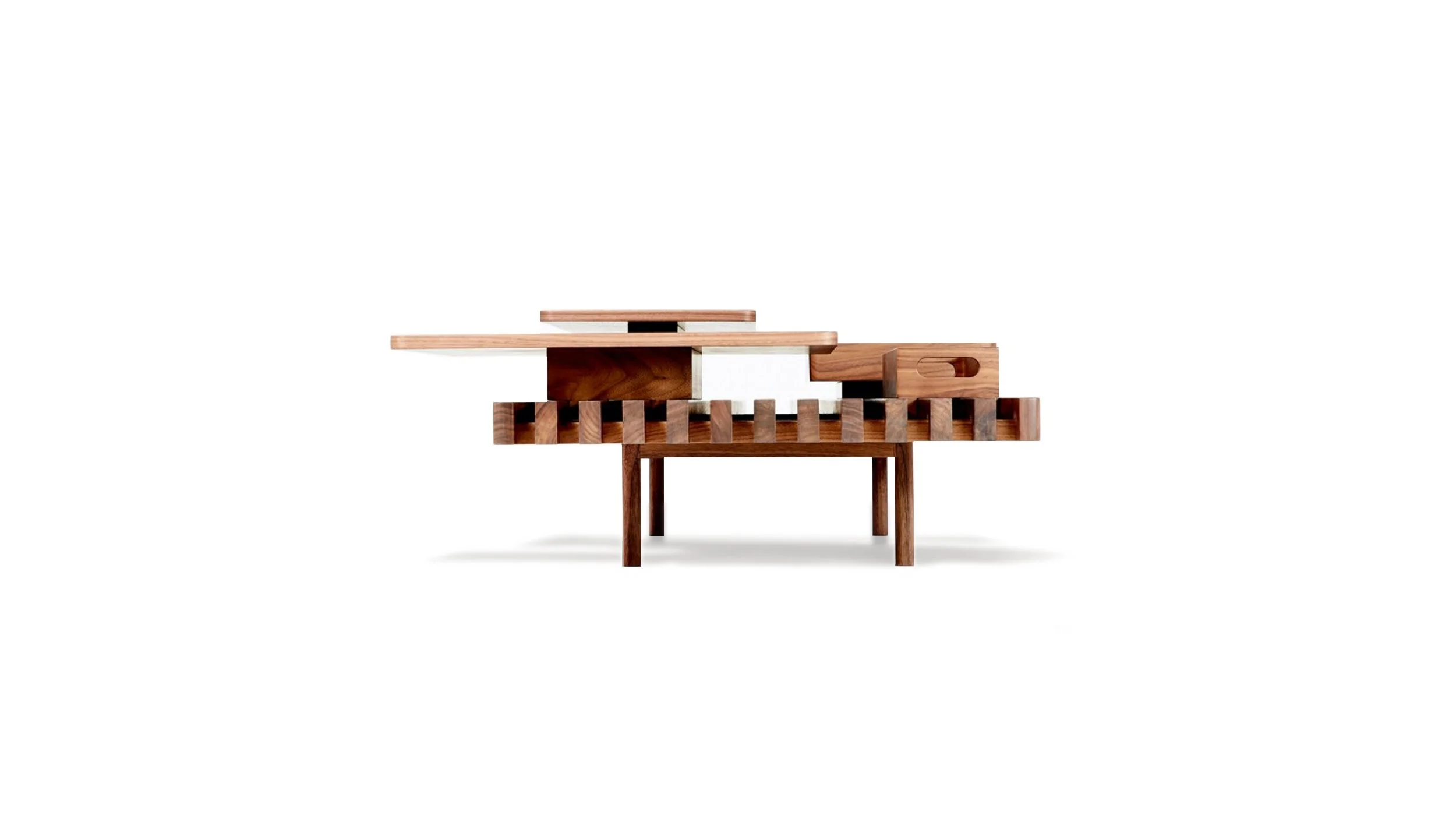 Track table, originally designed for Grafunkt in Singapore, the table also ended up at the Conran Shop. The centrepiece of the living room space is the Track table. It is made of a family of vessels, trays and surfaces which are placed over a slatted timber base.